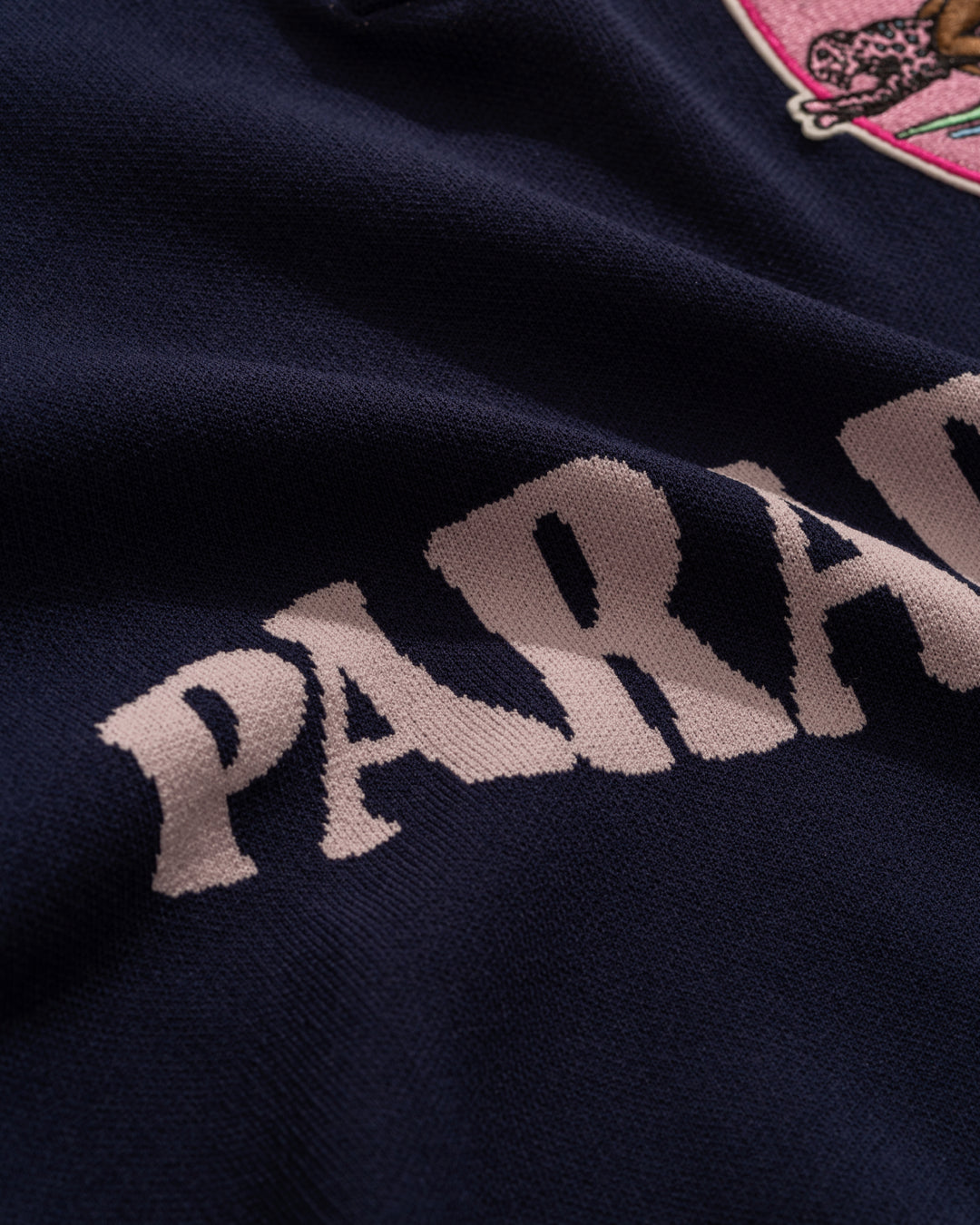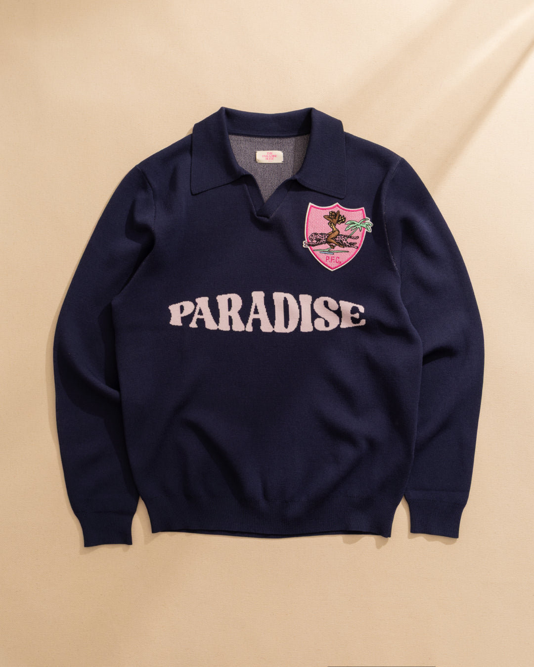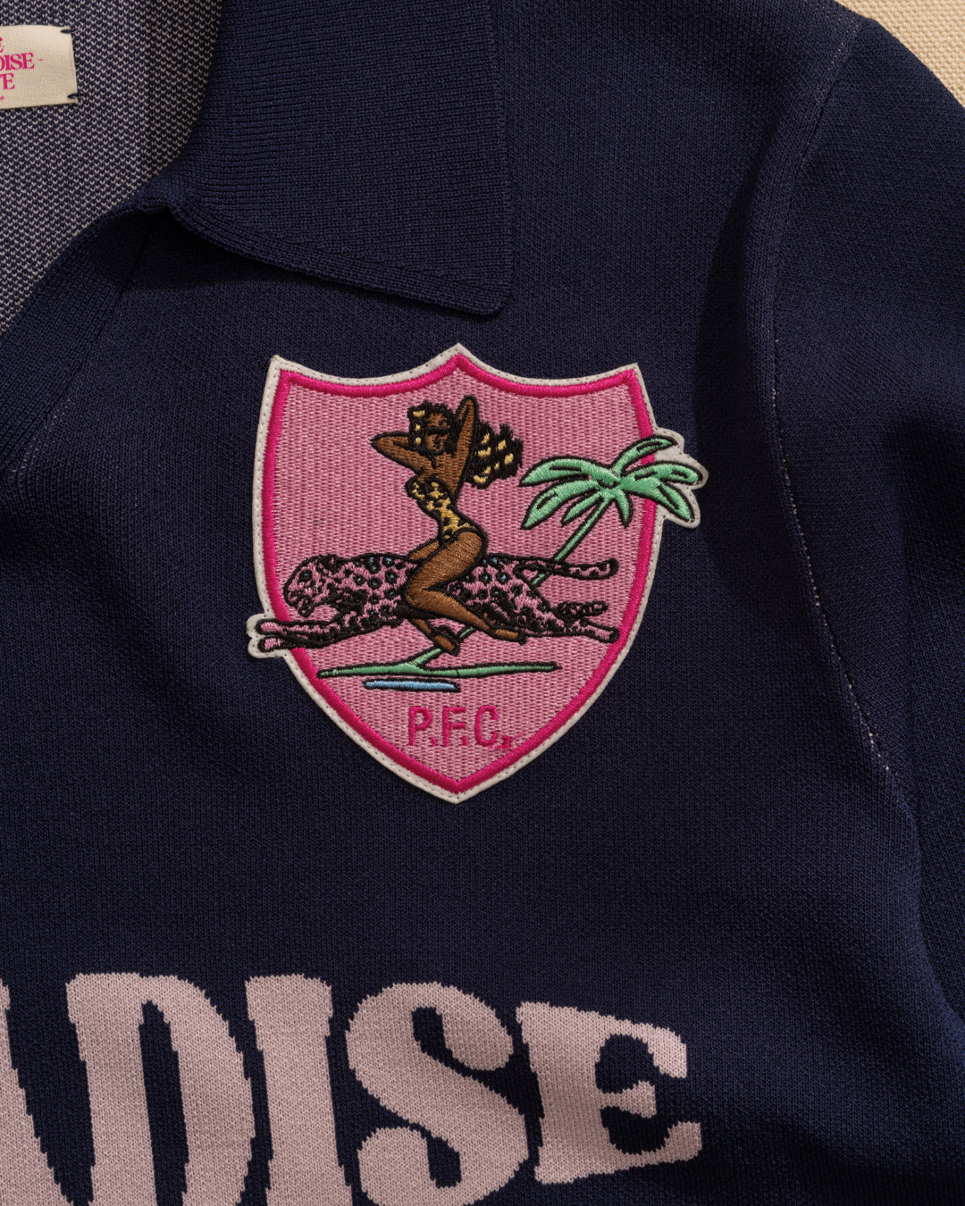 Intarsia”Paradise” logo at center chest