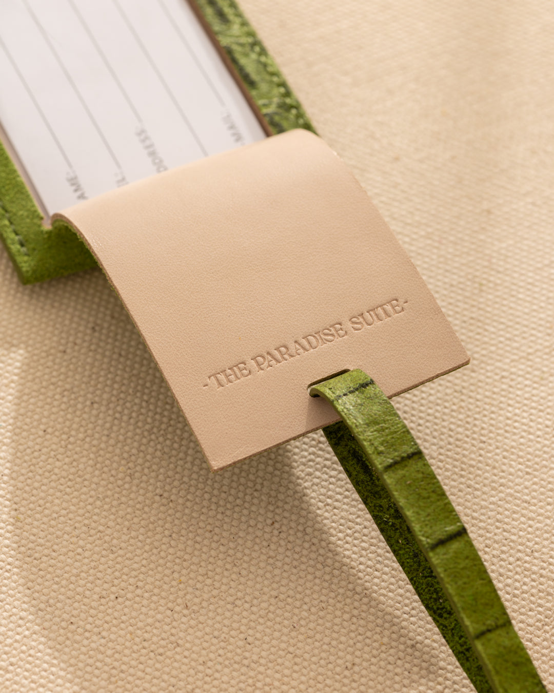 The TPS Journey Tag combines croc-embossed leather with a smooth suede backing to bring refined personalization to your luggage. Durable, distinctive, and unmistakably Paradise Suite, it’s a subtle detail that sets your bag apart and elevates your journey all the way to your destination.